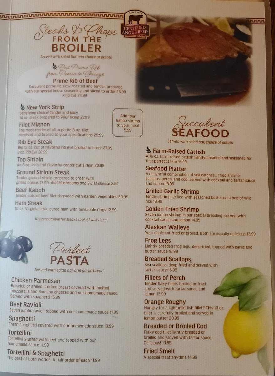 Evenings bring the treat of prime rib, praised for its great value and tenderness. Notably, the menu balances comfort and variety, ensuring something for everyone, from kids to adults. Delicious French fries rank among the best in Peoria, while a selection of desserts and drinks adds to the allure.